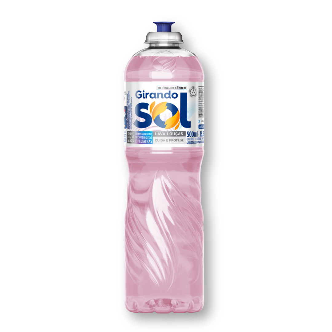 Detergente líquido hipoalergênico da Girando Sol em embalagem de 500 ml, formulado para limpeza de utensílios de cozinha com eficiência e cuidado extra com peles sensíveis. Produto testado dermatologicamente, com tensoativos biodegradáveis e indicação de uso diário em louças, talheres e superfícies laváveis.